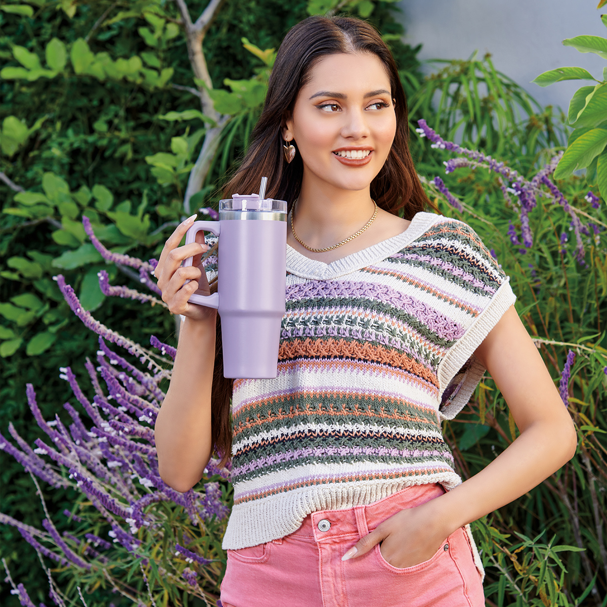Doble pared. Cerrado al vacío. Pared interna y externa acero inoxidable. Tapa de plástico con cierre de rosca y sobretapa giratoria de tres posiciones con ranura para popote. Incluye popote y asa de plástico. Mantiene temperatura caliente 6 hrs y temperatura fría 8 hrs aproximadamente. Incluye caja individual.